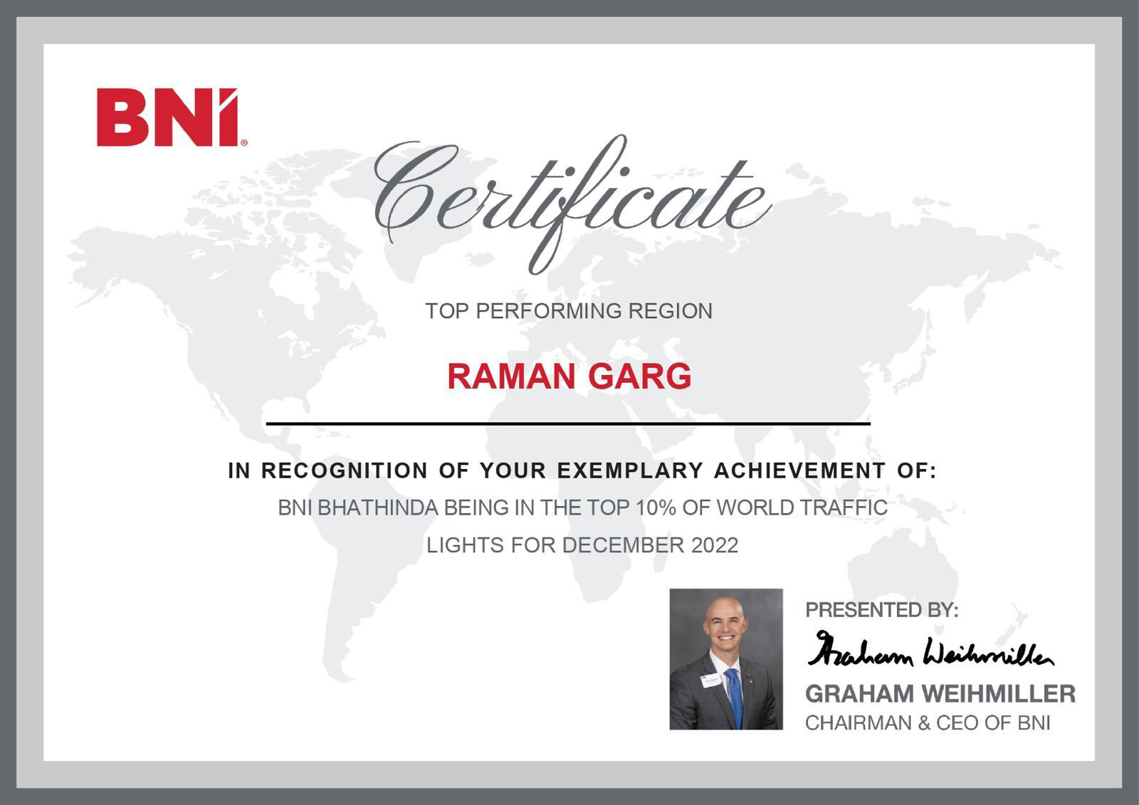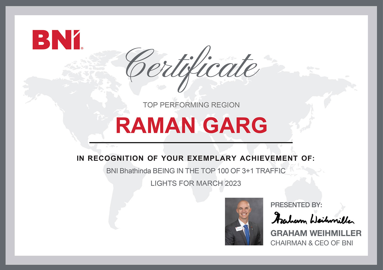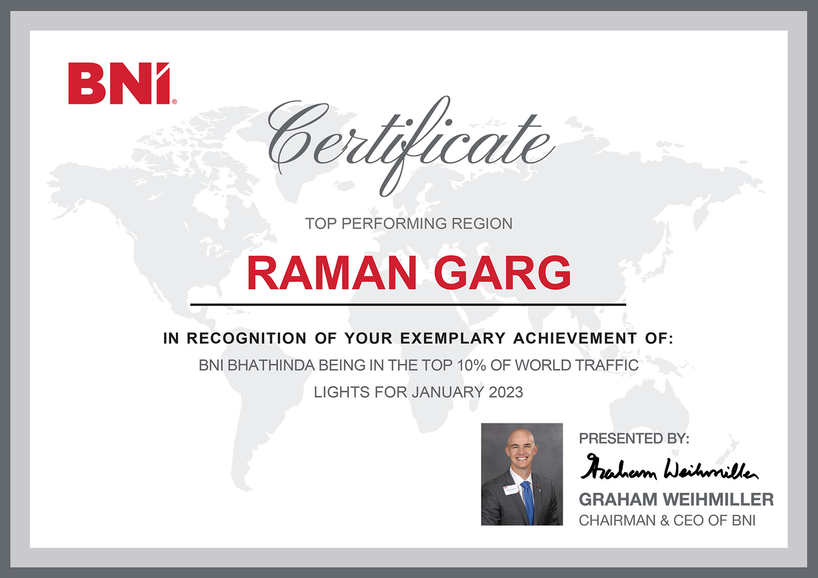 Raman Garg is a dynamic business leader serving as the Executive Director of BNI Bhatinda & North Rajasthan. With a background in Electronics and Communication Engineering, Raman has dedicated his career to fostering entrepreneurial growth and meaningful business networking. Under his leadership, BNI Bhatinda & North Rajasthan has become a thriving hub for business referrals, mentoring, and growth, connecting professionals from diverse industries. Renowned for his strategic vision and commitment to business excellence, Raman is a respected figure frequently endorsed by top business coaches. His passion is empowering business professionals to achieve success through collaboration, trust, and continuous learning.
